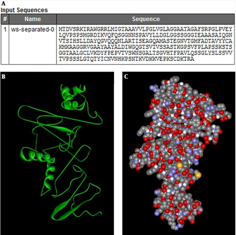 Appropriate immune epitopes were predicted according to BALB/c mouse H-2 class I alleles, including H2-Kd, H2-Dd, and H2-Ld. Three epitopes were selected based on high score values (including LSNRAVKPTGS, MTDVSRKIRAWGRRLMIGTAAAVVLPGLVGLAGGAATAGAFSRPGL, and FSRPGLPVEYLQVPSPSMGR with the total scores of 0.83, 0.81 and 0.71, respectively). Moreover, the protein sequence was submitted on IDEB/MHC II for evaluating potential binding with BALB/c mouse H-2 Class II alleles consisting of H2-IAd and H2-IEd. Subsequently, three epitopes were selected based on the highest score results via online tools, including QGNVTSIHSL, EAGQAMASTEGNVTGMFA, or VQFQSGGNNSPA with the cut-off scores of 0.72, 0.68, and 0.62, respectively.