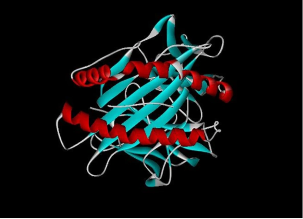 Physicochemical parameters of the new construct were evaluated by the ProtParam online tool. The properties of this construct included the number of amino acids: 293, molecular weight: 30 kDa, pH: isoelectric 8.29, negative charge: 20, positive charge: 22, half-life > 30 hours, aliphatic index: 78.57 and gravy: -0.01.