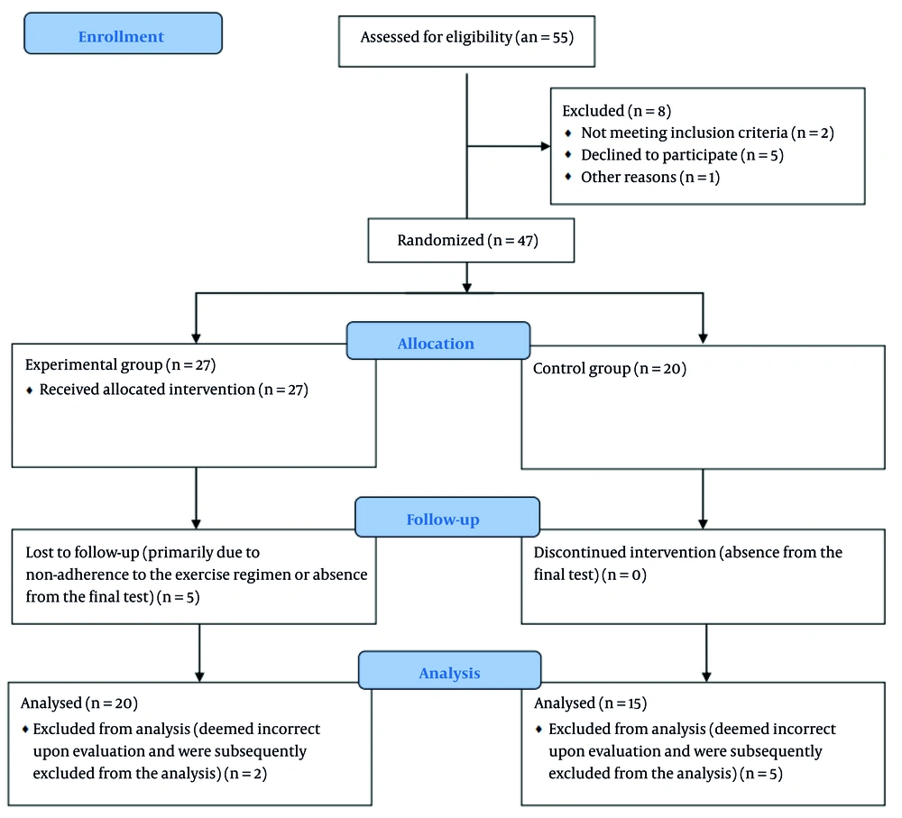 This experimental study was conducted at the COVID-19 center of Al-Zahra Hospital in Isfahan, Iran, over a period of six months, from February to July 2022. During the first four months of the study, 55 eligible patients were approached for potential inclusion in the study. Inclusion criteria of this study were hospitalized COVID-19 patients with a definitive diagnosis based on PCR tests or clinical and radiological evidence. Patients also needed to be diagnosed with respiratory complications of COVID-19 by a pulmonologist. The mean age of the included patients was 46 ± 5 years. Of these, 47 patients were accepted to participate and randomly assigned to either the experimental group (n = 27) or the control group (n = 20).