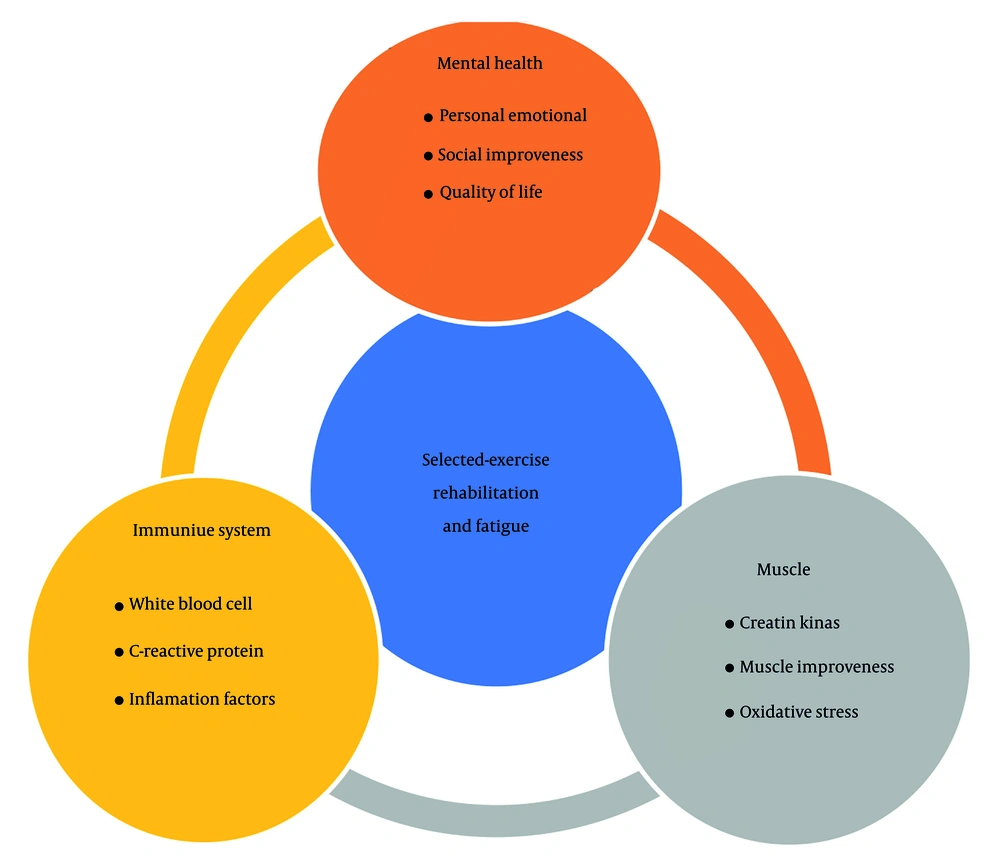 While the potential risks and contraindications associated with rehabilitation exercises for COVID-19 patients concerning their immune response must be considered, the positive influence of rehabilitation exercises on the immune system during COVID-19 recovery is often accompanied by observed improvements in immune function and various clinical outcomes, which are intertwined with other aspects of fatigue (24-26).