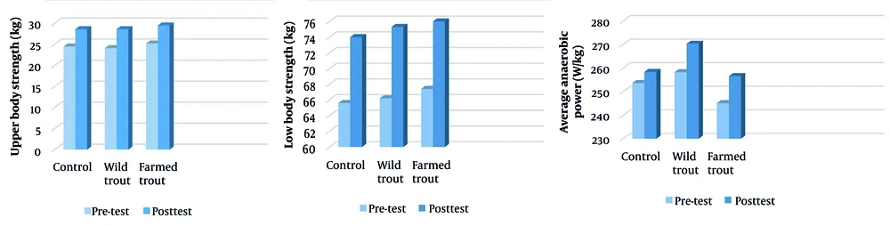 This study aimed to investigate the effects of consuming 50 grams of farmed and wild trout four to five times per week on exercise performance, lipid profiles, and vitamin D levels. Consuming four servings of farmed and wild trout did not affect upper and lower body muscle strength or anaerobic capacity in female bodybuilders. Studies examining the effects of fish consumption and its main components on athletic performance have been conducted in various populations, and the results of these studies have been somewhat inconsistent. A similar study reported in a review that fish oil consumption had no effect on endurance performance, muscle strength, or exercise adaptation (42). Lee et al. reported that omega-3 supplementation at 1.2 g of eicosapentaenoic acid and 0.72 g of docosahexaenoic acid per day for 12 weeks did not improve muscle strength and physical performance induced by resistance training, which is consistent with the findings of the current study (43). One study demonstrated that 18 weeks of omega-3 supplementation (3 × 1 g capsules daily, providing 2.1 g EPA/d + 0.6 g DHA/d) significantly improved muscle performance and quality (strength per unit muscle area) in older women undergoing resistance training. However, this effect was not observed in male participants (44). Smith et al. also noted that six months of omega-3 supplementation, without an exercise intervention, resulted in significant increases in grip strength (45). Mamerow et al. acknowledged that the anti-inflammatory properties of omega-3 supplements can affect muscle repair and growth, as well as increase muscle protein synthesis (46). In another study, Krzyminska-Siemaszko et al. reported improvements in body mass and muscle strength in elderly individuals after 12 weeks of omega-3 supplementation (47), which were inconsistent with the findings of the current study.