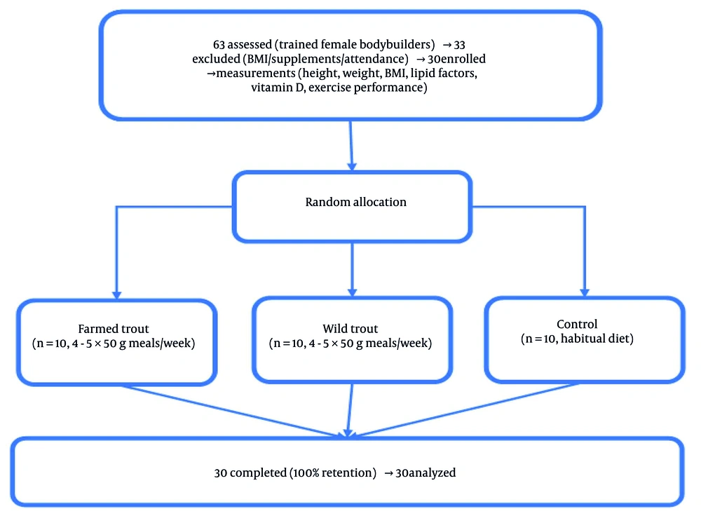 This study employed a quasi-experimental design with pre-test and post-test assessments, comprising three parallel groups: Two intervention groups (wild trout and farmed trout consumers) and one control group. Participants were non-randomly selected via convenience sampling from female bodybuilders training at Apadana Club in Rasht, Iran, but random allocation to groups was performed after recruitment to minimize bias. The statistical population consisted of female bodybuilders aged 20 to 30 years with ≥ 6 months of regular training history at Apadana Club. From 63 initial volunteers, 30 eligible participants were selected after screening based on inclusion/exclusion criteria. Sample size was determined using G*Power 3.1 software (α = 0.05, power = 80%, medium effect size).
