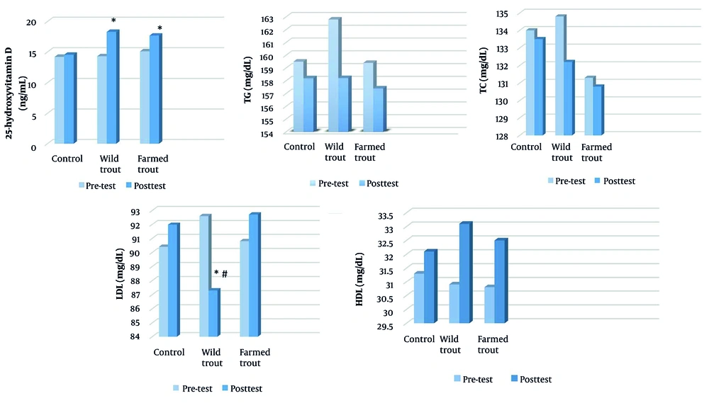 According to the results of the analysis of covariance, significant differences were observed in the variables of vitamin D and LDL among the three groups (P = 0.000). However, no significant differences were observed in the variables of triglycerides (P = 0.15), total cholesterol (P = 0.48), and HDL (P = 0.05) among the three groups (Table 4).