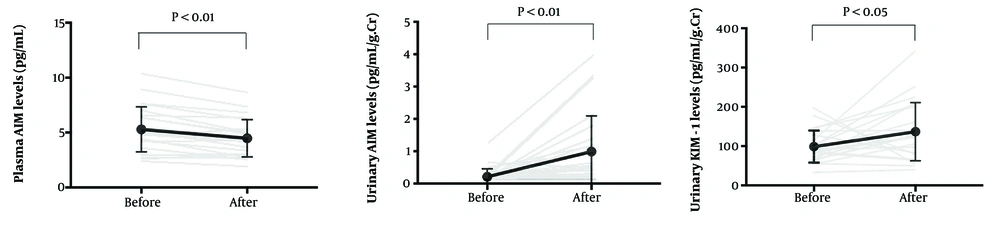 ![Response of plasma apoptosis inhibitor of macrophages (AIM), urinary AIM, and urinary kidney injury molecule-1 (KIM-1) levels to the marathon run [black circles represent means ± standard deviation (SD); gray lines represent individual changes]. Response of plasma apoptosis inhibitor of macrophages (AIM), urinary AIM, and urinary kidney injury molecule-1 (KIM-1) levels to the marathon run [black circles represent means ± standard deviation (SD); gray lines represent individual changes].](https://services.brieflands.com/cdn/serve/3170d/8d369f05f54e129e0616c7a99c480a955c944a80/asjsm-16-1-161117-i001-preview.webp)