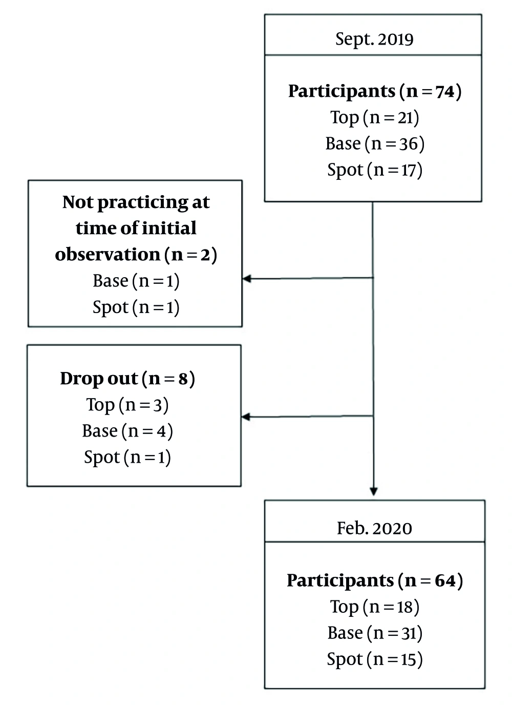 Over the 6-month study period, 64 of the 74 cheerleaders were observed (Figure 1). Of the 10 excluded cheerleaders, 2 were not participating in practice at the start of observation due to injury, and 8 quit the club during the study period. During the observation period, 29 injuries were reported in 8,025 AEs, resulting in an overall incidence rate of 3.61/1,000 AEs (95% CI: 2.30 - 4.93).