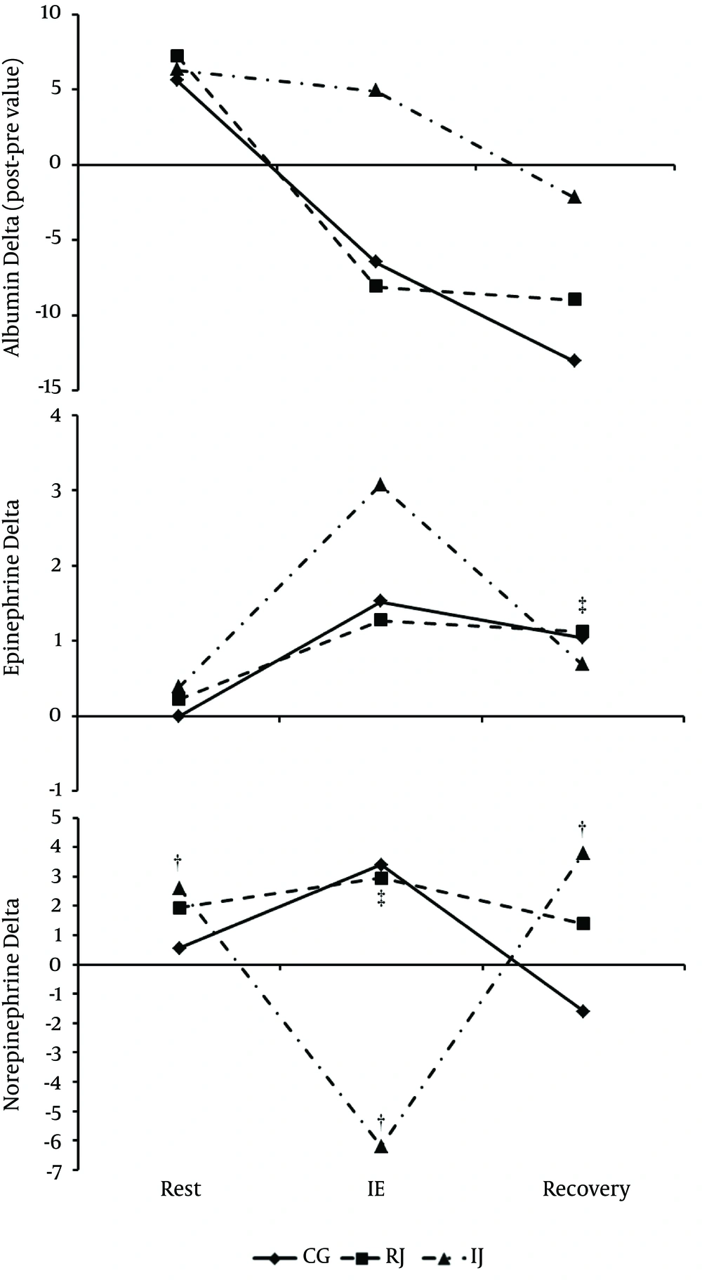 Since intensive exercise has been reported to be associated with enhanced sympathetic nervous system, previous studies reported that a decrease in salivary IgA level followed by high intensity exercise (> 80% VO2max) after 1 hour recovery period (19, 20). Several studies reported that trained athletes have greater basal concentration of catecholamine compared to untrained subjects (21, 22), higher concentration of catecholamine in anaerobic trained athletes compared to aerobic trained athletes, and different response to stimuli unlike untrained ones (23). Especially, trained athletes have been known to have a ‘sports adrenal medulla’; although, aerobically and anaerobically trained Judoists might have it or not (24). This study's results showed that concentration level of epinephrine was increased in all groups immediately after all-out exercise and at 30-minute recovery and there was no difference in all groups which is the same as a previous report (24). Moreover, there was no difference in all groups at rest and immediately after all-out exercise followed by 12-week training; however, there was significant increase in RJ at 30-minute recovery compared to IJ. This compensatory mechanism might be due to decreased sensitivity of human body to beta-adrenergic stimulation in RJ (23). Concentration level of epinephrine immediately after all-out exercise in IJ was higher than RJ after 12-week training and concentration level of epinephrine at 30-minute recovery was greater than RJ. This might come from decreased sensitivity of compensatory mechanism in RJ compared to IJ. Davis et al. (25) reported that mice's alveolar macrophage antiviral resistance followed by 8-hour prolonged strenuous exercise to fatigue was inhibited by increased plasma epinephrine. In this study, it seems that increased concentration of epinephrine level after all-out exercise in RJ having low variation tuned to recovery phase might have a more negative effect on immune function compared to IJ based upon different winter off-season training methods in Judoists.