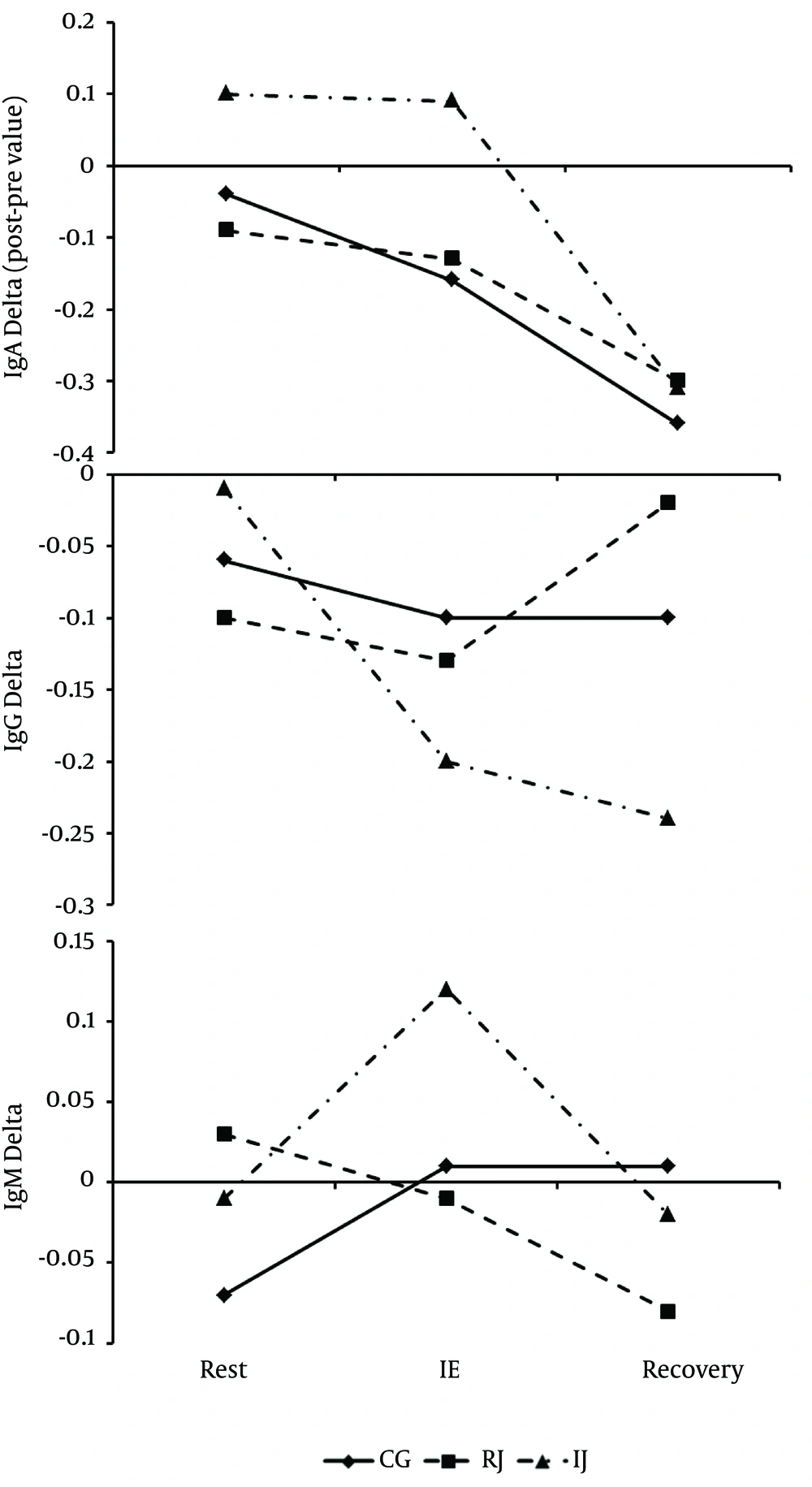 We expected that long term participation in training might cause URTI incidence change in Judoists because of reduced secretary IgA. However, there was no significant group difference at rest, immediately after all-out exercise, and 30-minute recovery. It seems that Judo training combined with resistance and interval training did not affect antibody secretion difference in Judoists. In other words, this can be explained that Judo training combined with resistance and interval training did not evoke immune system changes induced by overtraining through antibody synthesis in Judoists. Additionally, lymph flow rate stimulated by Judo training and additional training (resistance and interval training) can increase flux of different proteins into circulation (27); however, there was no lymph flow rate difference caused by additional training and therefore, there was no group difference.