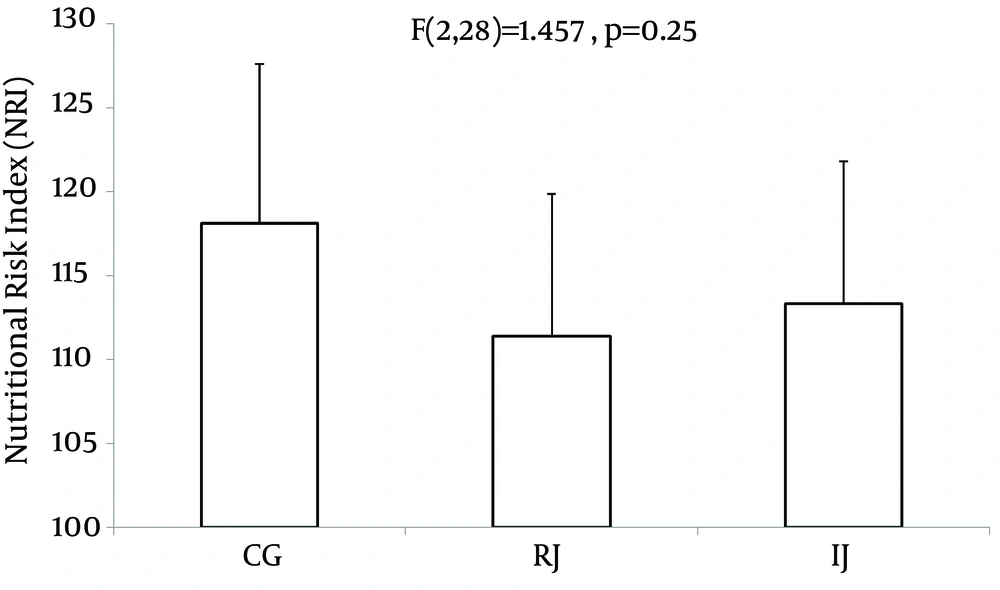 There was a significant interaction effect (group × period) in weight (P = 0.011), % fat (P = 0.03), HRmax (P = 0.018), and anaerobic mean power (P = 0.003). However, there was no significant interaction effect (group × period) in VO2max and anaerobic peak power. There was no significant interaction effect (group × period) in albumin after 12-week training; however, there was a significant interaction effect (group × period) in epinephrine after 12-week training (F (4, 52) = 3.216, P = 0.002) and immediately after all-out exercise and at 30-minute recovery (F (2, 26) = 14.564, P = 0.008). There was significantly higher changes in epinephrine of RJ compared to IJ at 30-minute recovery (P = 0.045). There was a significant interaction effect (group × period) in norepinephrine after 12-week training (F (4, 52) = 8.141, P < 0.0001), at rest and immediately after all-out exercise (F (2, 26) = 9.570, P = 0.001), and immediately after all-out exercise and at 30-minute recovery (F (2, 26) = 8.862, P = 0.001). There was a significant increase in group change of IJ compared to CG at rest after 12-week training (P = 0.014) and there was a significant decrease in group change of IJ compared to CG (P = 0.005) and RJ (P = 0.006) immediately after all-out exercise followed by 12-week training. There was a significant increase in group change of IJ compared to CG at 30-minute recovery followed by 12-week training (P = 0.036) (Figure 1). There was no interaction effect (group × period) in IgA, IgG, and IgM after 12-week training (Figure 2). During 12-week training period, there was no significant group difference in nutritional risk index (Figure 3).