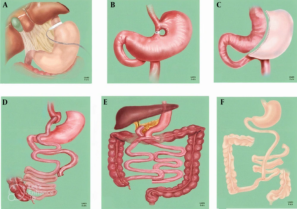 Bariatric surgical procedures: A; laparoscopic adjustable gastric banding; B, vertical banded gastroplasty; C, laparoscopic sleeve gastrectomy; D, Roux-en-Y gastric bypass; E, biliopancreatic diversion; F, jejunoileal bypass (41).