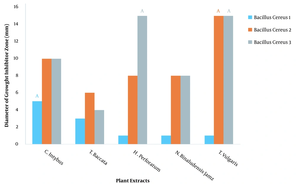 Throughout human history, many infectious diseases have been traditionally treated with herbal medicines, so that today in many developing countries, herbal medicines play a major role in primary treatment (16). Because different medicinal plants have different effects on microbes and the other hand, the use of different antibiotics has, unfortunately, become common among people (17, 18), so in the present study, some medicinal plants like Cichorium intybus L., Hypericum perforatum L., Lavandula angustifolia and Thymus vulgaris L. were collected from Shahrekord. Then their extracts were evaluated on how to inhibit the growth of Bacillus cereus.