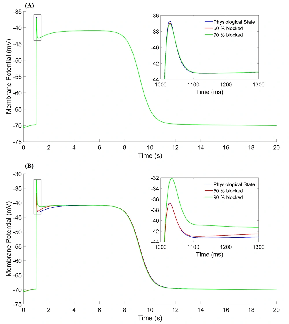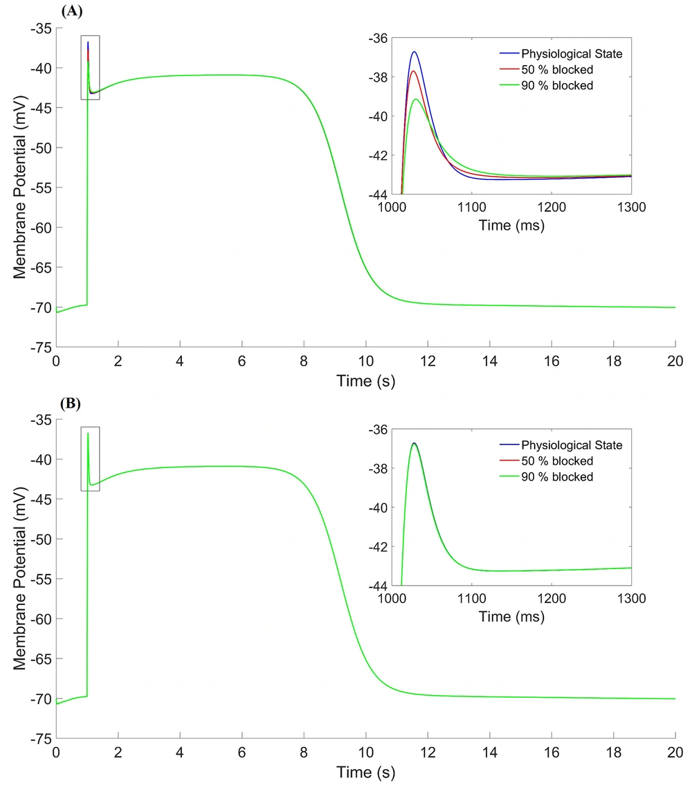 Finally, the condition of the channel gates [the time constant of the gate (τ)] was examined in three states, and changes were applied in the coefficients of this parameter. (1) Physiological state, (2) 50% blockage [50% of the time constant], and (3) 90% blockage [90% of the time constant]. The time constant of the gating variables is considered a symbol of closed gates.