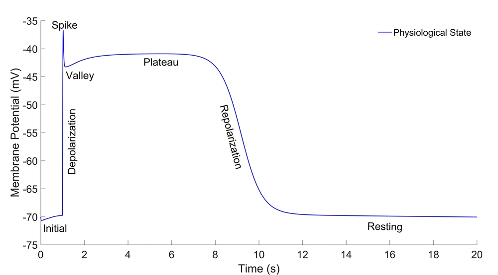 In this study, the role of potassium channel gates on the slow-wave was investigated in the HGSMC. Due to the similarity of gastrointestinal cells (smooth muscle, ionic currents, slow-wave curve), the gastric cell model was adapted from the electrophysiological model of the colon (17). Then, gastric cell properties were placed in the colon model and a slow-wave was obtained similar to Corrias's study (15), and experimental findings (20, 21). To compare the results, the value and time of membrane potential were used at several indicator points in the slow-wave curve. Three states (physiological, 50% blockage, 90% blockage) were considered to evaluate the condition of the channel gates, and the results were compared in the indicator points.