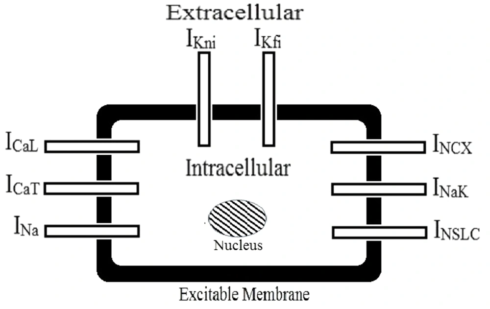 Hodgkin-Huxley's approach was used to simulate and model the gastric cell. The Hodgkin-Huxley approach assumes a cell membrane as an electronic circuit. This model (Equation 1) is used to calculate changes in cell membrane potential over time (