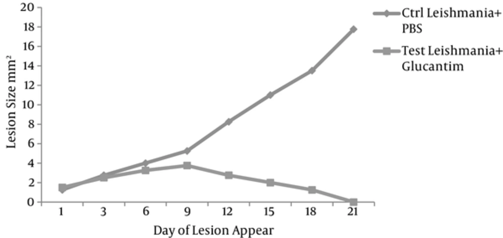 After a week of infection, Leishmania lesions were developed. The size of Leishmania lesions were measured and compared in every 3 days for at least 3 weeks until all lesions cured. The interventional group achieved clinical amelioration (within 3 weeks) as a result of Glucantime treatment and all lesions completely disappeared. In contrary, all of the mice in the control group died within 2 weeks (Figure 2).
