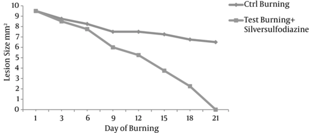 The results showed that in the first week, the size of lesions in the group test receiving Silver sulfadiazine treatment was not significantly different compared to those of the group control, however, the interventional groups produced less fibrin deposition. Healing of the lesion ameliorated during the second week. This procedure was more progressive in the interventional group and at the end of the third week. More healing in the intervention group resulted in re-epithelialization.