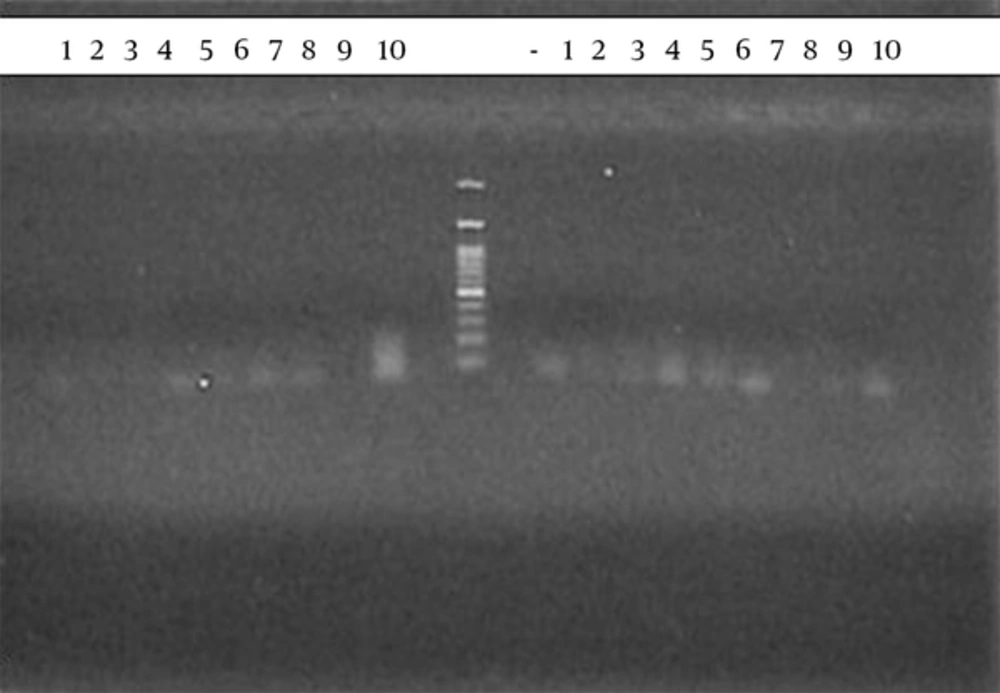 According to the manufacturer’s instructions, RT-PCR was performed using the DENAzist kit. A mixture of 10 μg total RNA-primer, 1 μL oligo dT primer, 1 μL dNTP, and nuclease-free water up to 10 μL was prepared. The mixture was incubated at 65°C for 5 minutes and chilled on ice for 2 minutes. A mixture of cDNA Synthesis (10X Buffer M-MuLV 2 μL, M-MuLV reverse transcriptase 100 unit, nuclease-free water top up to 10 μL) was prepared and 10 μL of the cDNA synthesis mixture was added to each RNA-primer incubating at 42°C for 60 minutes followed by an extra incubation at 85°C for 5 minutes and then chilled on ice. DNA amplification was performed using a PC-708-02 thermal cycler (ASTEC; Fukuoka, Japan). The PCR was programmed as 40 cycles of denaturation at 95°C for 30 seconds, annealing at 4°C less than the melting temperature of the primers for 30 seconds and an extension step at 72°C for 20 seconds. An initial denaturation step of 95°C for 10 minutes before the cycles and a final extension step at 72°C for 10 minutes after the cycles was also applied. Distilled water was used as negative control.