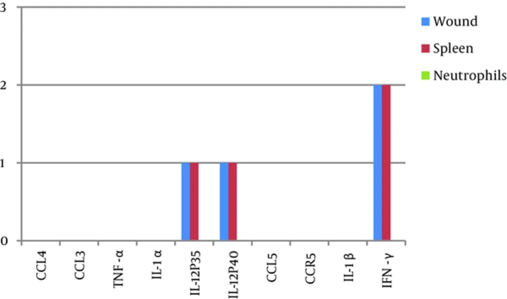 On the other hand, the expressions of the same genes in burning lesions were also evaluated. In the control group, which received no treatment, the expression of IFN-γ, IL-1β, CCR5, IL-12p35, and IL-12p40 genes was detectable during the first week of the burning. In the second week, TNF-α, IL-1α, IL-12P35, IL-12P40, IL-1β, and IFN-γ genes were significantly expressed (Table 3, Figures 3 and 5).