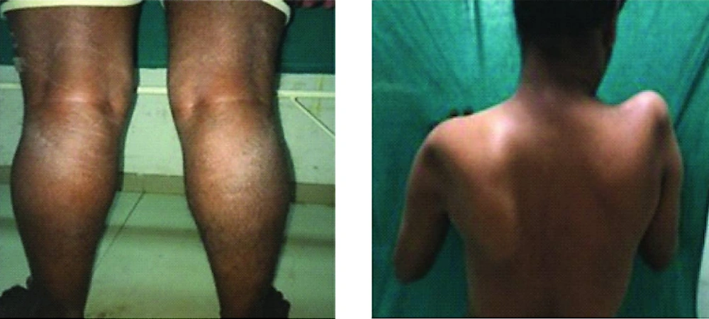 Patient 1 in the presented study was a 10-years old boy: Muscular atrophy of the patient’s neck area and also atrophy of both shoulders with the loss of both deltoids and muscular analysis of the patient’s left shoulder blade (Right). Muscular analysis of the patient's leg area. Thinning of the thighs and pseudo-hypertrophy (Left).