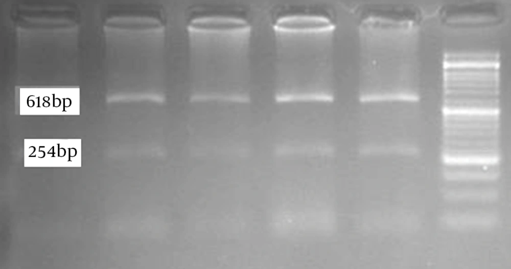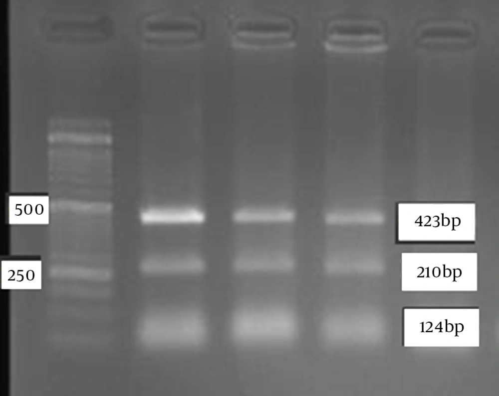 The TaqI restriction enzyme digests the PCR product of a fragment of exon 2 with a length of 757 bp, and it creates three pieces of 423 bp, 210 bp and 124 bp in a normal sequence. All of the patients showed this pattern of digestion, so all of them were considered as normal (Figure 1).