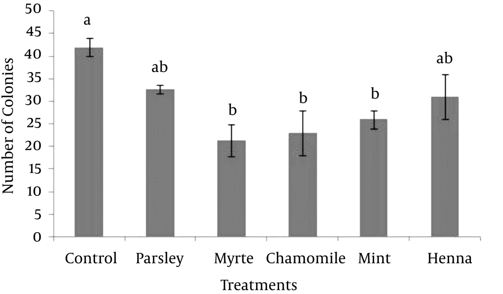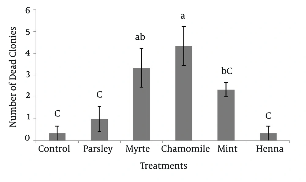 The numbers of dead SSC colonies in the presence of five herbal extracts are shown in Figure 3. The results indicated that, chamomile had the greatest effect (4.33 ± 0.88) on mortality of SSC colonies. The dead colonies of SSC in henna (0.33 ± 0.33) were significantly lower (P < 0.05) compared to myrtle and chamomile. Other results showed that there was no significant difference between myrtle with mint and myrtle with chamomile on survival of SSC colonies.