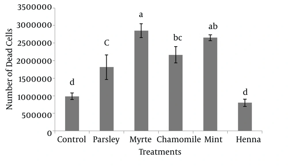 The results indicated that myrtle, mint, chamomile and parsley significantly increased the number of dead spermatogonial and Sertoli cells in comparison to henna and control groups (P < 0.05), and there was no significant difference between henna and the control (P > 0.05) (Figure 4).