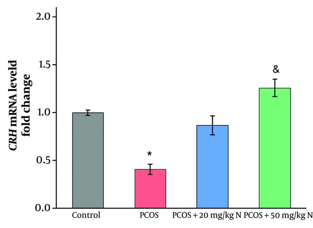 The consumption of herbal remedies has a positive association with the reduction of infertility problems. Previous studies have investigated the effect of naringenin on managing amenorrhea and abnormal ovulation. In the current study, CRH gene expression decreased in the PCOS group compared to the control. However, CRH mRNA levels returned to the baseline level of intact rats following naringenin injection for two weeks. Previous studies also indicate a decrease in CRH levels in PCOS patients compared to intact rats, supporting the present findings (11). Corticotropin-releasing hormone is synthesized in the hypothalamic paraventricular nucleus (PVN) and has various physiological functions, including the regulation of behavior, nutrition, reproduction, and GnRH neuron function (12). Evidence suggests that CRH is involved in steroid biosynthesis, inflammatory processes, ovulation, and luteolysis (13). In PCOS patients, the decrease in CRH gene expression may be due to increased androgen levels. The CRH neurons express androgen receptors (ARs), indicating that these neurons are targets for androgen action. The suppressive effects of androgens on CRH may occur directly by binding to ARs on CRH neurons in the PVN, or androgens may act on CRH neurons indirectly via the bed nucleus of the stria terminalis (BNST), the medial preoptic area (mPOA), the suprachiasmatic nucleus (SCN), and the arcuate nucleus (ARC). The PVN receives afferent signals from these areas, which play a crucial role in regulating the HPA axis response (14).