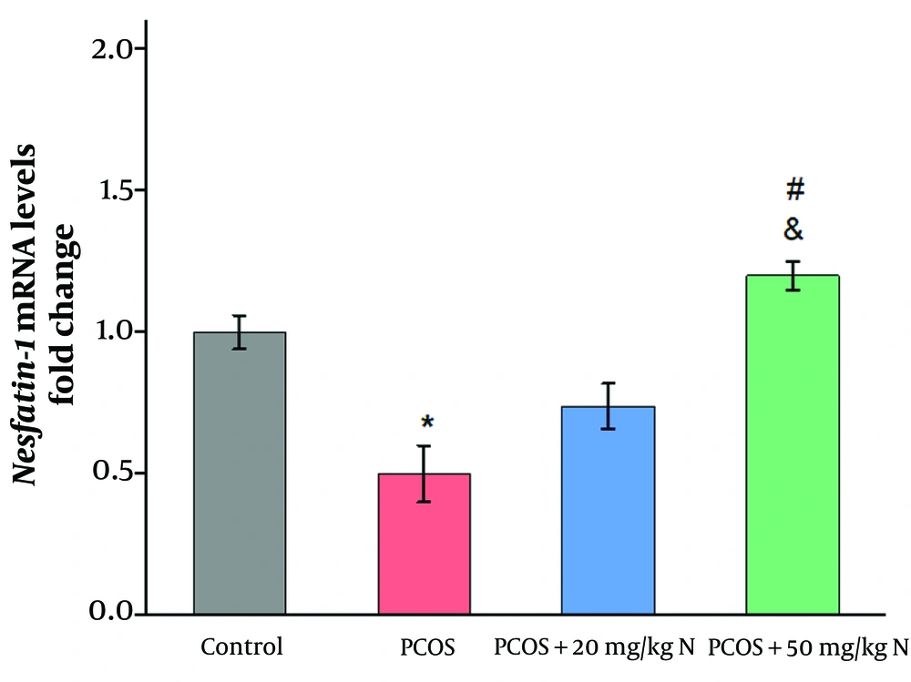 In the present study, the effect of naringenin on hypothalamic gene expression of nesfatin-1 was investigated in a rat model of estradiol valerate-induced PCOS. Results showed a significant decrease in nesfatin-1 gene expression in the PCOS group compared to the control group, consistent with previous studies (27). Several studies in rats indicate the presence of nesfatin-1 and its co-expression with other transmitters in the brain, particularly in hypothalamic nuclei such as the PVN and ARC (28). Evidence suggests that nesfatin-1 can regulate reproductive function by acting directly on GnRH neurons (29). Research indicates a positive relationship between nesfatin-1 and levels of follicle-stimulating hormone (FSH), estrogen, and progesterone. Low levels of nesfatin-1 in PCOS impair follicular growth by inhibiting FSH (30).