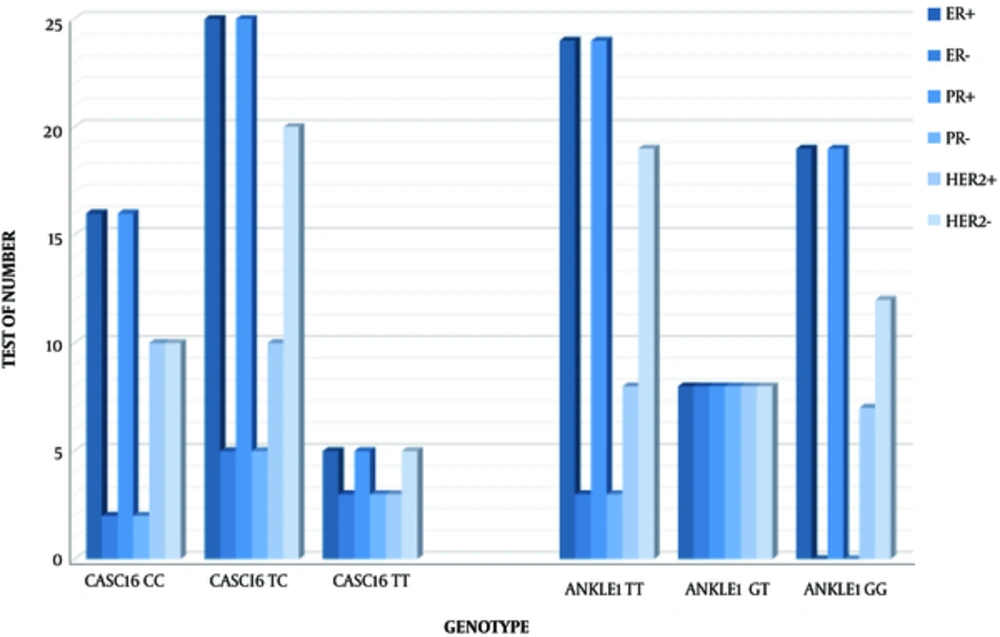 In addition, it has been shown that a significant association in low allele in ANKLE1 (rs2363956) GT and then CASC16 (rs3803662) TT to ER and PR negative tumor by Immunohistochemi- pathology.