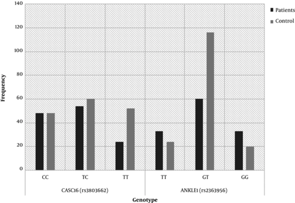![Column Chart genotypes frequencies [n (%)] for cases and control: Analyses of 126 affected women and 160 controls. Column Chart genotypes frequencies [n (%)] for cases and control: Analyses of 126 affected women and 160 controls.](https://services.brieflands.com/cdn/serve/3170b/7498614c952859bb816d2046bc94f61c42f3fefb/gct-In_Press-In_Press-63407-i001-preview-preview.webp)