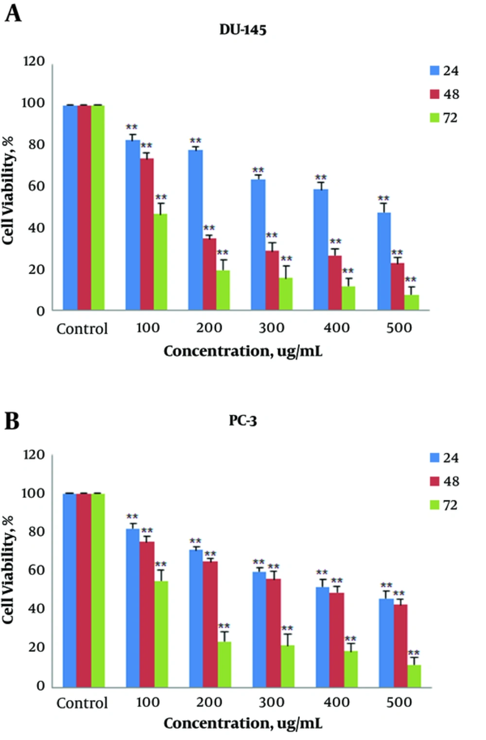 Cells were exposed with concentrations (100, 200, 300, 400, and 500 µg/mL) of extract for different times (24, 48 and 72 hours). MTT assay was used for measuring their proliferation. LOHE declined proliferation of both DU-145 (A) and PC-3 (B) prostate cancer cells in a time- and concentration-dependent fashion. Each value is presented as a mean ± SD of 3 experiments (each triplicate). *P < 0.05; **P < 0.01 compared to adjusted control groups.