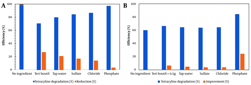 The effects of various anions, including phosphate, sulfate, chloride, tert-butanol, and municipal water, each at a concentration of 1 mM in 200 mL of TC solution, on the reduction of TC removal efficiency under the optimized operating conditions (time = 90 min, H₂O₂ = 2 mg/L, pH = 7, TC = 10 mg/L, wavelength = 359 nm) were investigated in both the VUV and VUV/H₂O₂ processes (Figure 4A and 4B). As shown in Figure 4A, the removal efficiency of TC in the VUV photolysis process was approximately 60% in the absence of anions. However, the presence of sulfate, chloride, municipal water, tert-butanol, and phosphate caused a substantial decrease in TC removal efficiency, reducing it to 3.84%, 3.96%, 4.22%, 6.22%, 6.44%, and 24.4%, respectively. According to Figure 4B, the VUV/H₂O₂ system achieved complete TC removal (100%) in the absence of anions; nevertheless, its efficiency was also notably inhibited by the same anions. In the presence of phosphate, chloride, sulfate, municipal water, and tert-butanol, the TC removal efficiency dropped to 2.74%, 13.4%, 15.6%, 20.6%, and 29.4%, respectively.