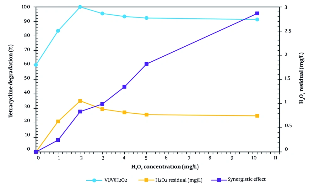 At 120 minutes into the VUV process (photolysis), the TC removal rate was 60%; however, when H₂O₂ = 2 mg/L is added to the VUV process (VUV/H₂O₂), the TC degradation rate is 4.76 and 100%, respectively. Thus, a 35.44% synergistic impact of VUV/H₂O₂ was obtained according to Equation 16. As a result, the ideal surface was determined to be 2 mg/L of hydrogen peroxide concentration. Peng et al. looked into the ibuprofen degradation process using UV/H₂O₂. They discovered that when H₂O₂ concentration increased, ibuprofen degradation increased from 0.1 to 0.6 mM. In their investigation, 0.54 mM hydrogen peroxide concentration was found to be the optimal surface, and it was chosen (41). In the VUV/H₂O₂ process, it took 315, 120, 140, 165, 180, and 210 minutes, respectively, to reach the removal efficiency of 100% TC at various hydrogen peroxide concentrations (1, 2, 3, 4, 5, and 10 mg/L).