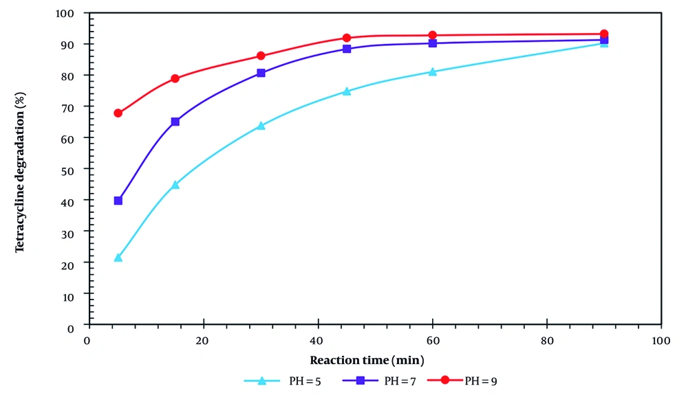 TC is an amphoteric molecule, and its speciation depends on pH: It is predominantly positively charged at acidic pH (~4) and negatively charged at alkaline pH (~9). At neutral pH (pH 7), TC exists mainly in a zwitterionic form, which provides a balance between its interaction with OH• radicals and solubility, resulting in optimal degradation (36-38). This explanation aligns with previous studies, such as Elmolla and Chaudhuri, who reported increased degradation of amoxicillin (AMX) at neutral to slightly alkaline pH using UV/TiO₂ and UV/H₂O₂/TiO₂ processes (39). Therefore, pH 7 was selected as the optimal condition because it provides a favorable balance between TC speciation and OH• availability, ensuring efficient degradation without significant radical scavenging or photodecomposition losses.