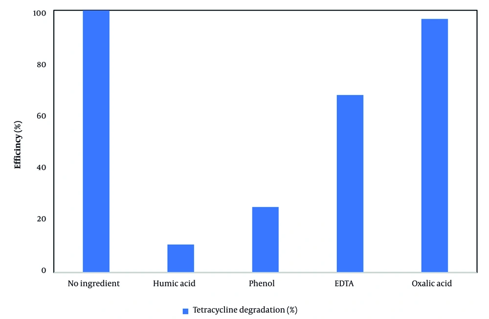 Under optimal conditions—reaction time of 90 minutes, H₂O₂ concentration of 2 mg/L, pH 7, TC concentration of 10 mg/L, and irradiation wavelength of 359 nm—the effects of various organic compounds, including phenol, EDTA, oxalic acid, and humic acid, were investigated in the VUV/H₂O₂ process. Each organic compound was added at a concentration of 1 mM to 200 mL of TC solution. As illustrated in Figure 5, complete degradation of TC (100%) was achieved in the absence of organic compounds. The presence of these organics, however, decreased the TC removal efficiency as follows: Oxalic acid (96.7%), EDTA (67.7%), phenol (25%), and humic acid (10.7%). Among them, phenol and humic acid exhibited the most pronounced inhibitory effects. This reduction in efficiency is attributed to the competition between the organic molecules and TC for hydroxyl radicals (OH•) generated during the VUV/H₂O₂ process (50).