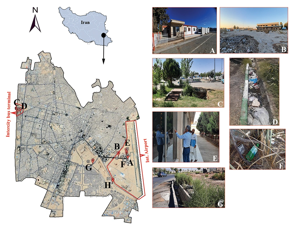 Spatial distribution of invasive Aedes aegypti adults and larvae detected in Zahedan, Southeastern Iran (January - July 2025): A, warehouse chamber near the runway of Zahedan International Airport; B, booth of an under-construction airport building; C, water meter pit at the intercity bus terminal; D, side-road gutter at the intercity bus terminal; E, discarded plastic cup near the airport warehouse chamber; F, external window glass of the airport waiting hall; G, side-road gutter along a boulevard near residential areas; H, Zahedan customs.
