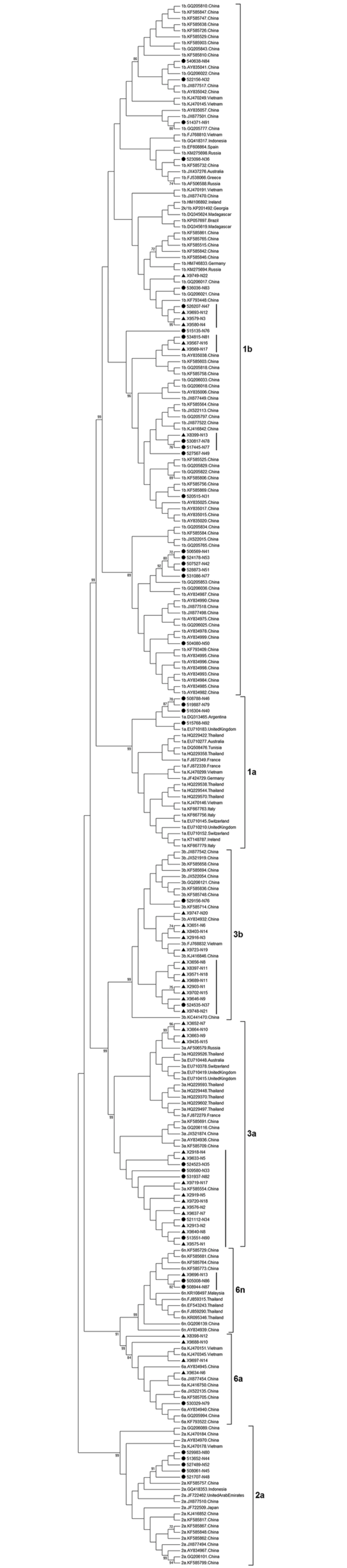 A 377-nt NS5B partial sequence was successfully amplified in 37 out of 179 specimens positive for anti-HCV, whereas it was not amplified in any specimens negative for anti-HCV while positive by NAT. Genotype was classified as 1a (n = 4), 1b (n = 18), 2a (n = 5), 3a (n = 5), 3b (n = 2), 6a (n = 1), and 6n (n = 2). Additionally, thirty nine 377-nt partial sequences isolated in the local IDU were included in the study as follows: 1b (n = 7), 3a (n = 14), 3b (n = 13), 6a (n = 4), and 6n (n = 1). Within genotype 1b, 3a, 3b, 6a, and 6n, VBD and IDU strains shared the sequence identities of 91.3% - 94.7%, 94.6% - 96.8%, 95.3% - 97.5%, 94.1% - 96.9%, and 97.4% - 99.6%, respectively.