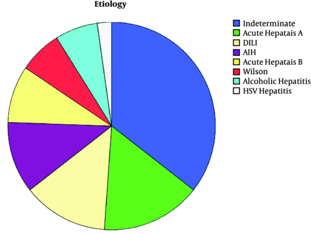 The medical history was thoroughly evaluated by adult or pediatric hepatology services. Any history of previous chemical or herbal drug, alcohol consumption, or toxin exposure was recorded. Histories of any past or recent liver diseases in the family, ill contacts, drug injection, tattooing, sexual contacts, and any recent travels were obtained. Extensive evaluations were done to diagnose the etiology of liver disease. Viral hepatitis was diagnosed with positive serology test or molecular assessment, which included HAV IgM antibody for hepatitis A, HBS antigen or HBc IgM antibody for hepatitis B, HCV antibody for hepatitis C, HEV antibody for hepatitis E, serum molecular tests for Cytomegal virus, and Ebstein Barr virus. Herpes simplex virus hepatitis was diagnosed by performing molecular test for the mentioned virus on liver tissue. Autoimmune hepatitis (AIH) diagnosis was based on the criteria defined by the autoimmune hepatitis foundation group (9). Wilson disease was diagnosed based on ceruloplasmin level < 20 mg/dL and urine copper level > 100 μg/24 hr. Additional data including positive family history of Wilson disease and ratio of alkaline phosphatase to total bilirubin < 4 and AST: ALT > 2.2 were also used according to Korman et al. to help achieve a more accurate diagnosis (10). Alcoholic hepatitis was diagnosed according to the patient’s history of heavy alcohol drinking. The cause of ALF was considered indeterminate when all investigations for the cause of liver disease were inconclusive. Data from the time of admission for each patient were used for analysis.