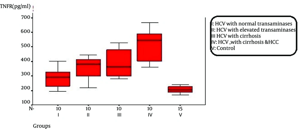 Thus, in the current study we determined the value of serum level of sTNFR-IIα in the diagnosis and early detection of HCC in patients with chronic HCV infection. Our results revealed that there was no statistically significant difference regarding age between patients with HCC and other studied groups, which disagreed with Zekri et al. who stated significantly higher mean of patients' age with HCC than that of the other groups (31). This might be related to under diagnosis of early stage cirrhosis, which had started at younger age, possibly due to low rates of biopsy. This was in concert with results of a previous cohort (35) that reported a significant increase in the prevalence of cirrhosis and HCC in patients with HCV infection over the past ten years. The authors added that after adjustment for sex and increasing age of the HCV cohort, the upward slopes in the prevalence of cirrhosis and HCC were lower than the corresponding slopes in the crude rates. They concluded that aging of the patients with HCV infection explains a significant proportion of the rising trend in the prevalence of cirrhosis and HCC (20% and 47%, respectively) with time. Another explanation is that patients with HCV acquired their infection earlier and thus, would have had their infection for a longer time with age progression. If it was true, it would mean that the HCC prevails. Lastly, records from previous studies are liable to be misjudged; the data from recalibrated mathematical models suggest that the age prevalence prevalence of HCV and cirrhosis might be definitely higher than was previously reported (36).