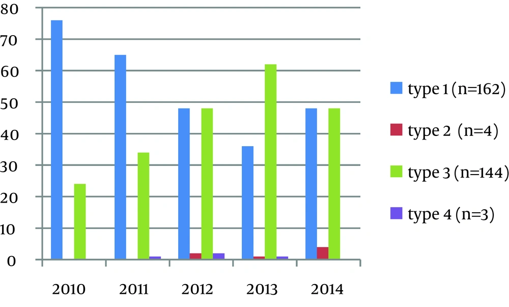 The HCV genotyping has an important role in the selection of appropriate therapy, duration of treatment, and close monitoring of the response to therapy, in patients with chronic hepatitis C infection. The response to interferon therapy, in patients infected with HCV genotypes 1 and 4, is poorer and the duration of treatment is longer, compared to patients infected with genotypes 2 and 3. In addition, patients infected with genotype 1b have been reported to have a higher risk of developing hepatocellular carcinoma. The HCV genotyping, besides shaping the treatment, also provides information regarding the prognosis of the patients (8). Of the 313 patients who were found to be positive for HCV RNA, 67.7% were males, who were significantly predominant among these patients (P = 0.0001). Although other studies conducted in Turkey and Pakistan showed no significant difference in terms of gender, the results of the present study showed male predominance, which was parallel to the findings of a study conducted in Iran (79.6%) (11-13). When genotype distribution was evaluated in terms of gender, genotype 3 showed 95.8% male predominance and type 1 showed 56.7% female predominance. The mean age of the patients in our study was 41.29 ± 20.32 years. This result was consistent with the findings of Hadinedoushan et al. (13), who reported an age range of 21 - 31 years for genotype 1a and the predominance of genotype 3 in all age groups, beyond this age group. The mean age was 55 years in 161 patients with genotype 1. This finding was consistent with the finding of Buruk et al. (11). When the mean age was analyzed separately for each year, the mean age for type 1 was 48 years in 2010, 54 years in 2011, 60 years in 2012, 60 years in 2013, and 62 years in 2014. There was an increase in the mean age, between 2010 and 2014. The mean age was 25 years in 138 patients with genotype 3. There was an increase in the mean age for type 3, when it was analyzed separately for each year. The mean viral load for HCV RNA was 1.9 × 106 IU/mL. There was no significant correlation between viral load for HCV RNA and HCV genotype. Likewise, Hadinedoushan et al. (13) did not report any relationship between viral load and genotype. The genotype distribution pattern in Turkey shows the predominance of genotype 1 (57.6 - 100%). In general, genotype 1 is more common in the interior regions and it is reported to be less common in large cities and in those allowing the flow of immigrants (7, 11, 14-24). The studies related to HCV genotype distribution in Turkey are presented in Table 2Figure 2.