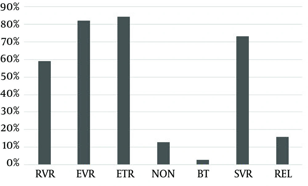 Rapid virological response (RVR) was defined as HCV RNA negativity at week four of treatment; early virological response (EVR) was defined as HCV RNA negativity at week 12 of treatment; ETR was defined as HCV RNA negativity at the end of treatment; SVR was defined as undetectable HCV RNA for 24 weeks after ETR. Non-responsive was defined as a patient who failed to achieve a decline of 2log10 HCV RNA IU/mL after 12 weeks of treatment or who never achieved undetectable HCV RNA during treatment duration of 24 weeks. Breakthrough (BT) was defined as reappearance of HCV RNA at any time during treatment after virological response. A relapse referred to detectable HCV RNA in serum after treatment discontinued and an ETR documented.