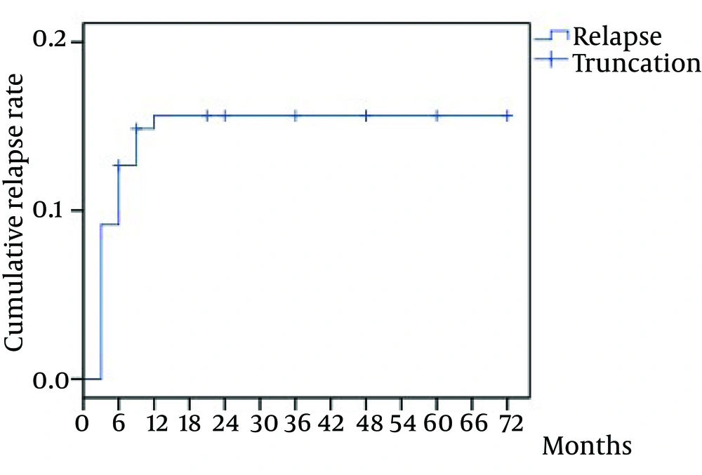 The median duration of follow-up was 22.93 months (range, 6 - 72 months). The overall rate of relapse was 13.6% (23/169) in the study cohort, while a recurrence of HCV RNA rate in cases of ETR was 16.20% (23/142). The earliest time of detectable HCV RNA was at the first month follow-up, the latest was at 48th month. Twenty-three patients had recurrence during follow-up 56.5% of which (13/23) relapsed between zero and 12 weeks after treatment, 21.7% (5/23) between weeks 12 and 24, and 17.4% (4/23) between 24 and 48 weeks. Otherwise, HCV RNA remained at undetectable levels at follow-up from two to six years, except in one patient (1/23) in whom it was detected at fourth year. The relapse rate within six months was significantly higher than other periods during six years of follow-up (χ2 = 7.792, P = 0.005). The cumulative rate of relapse increased more rapidly within six months and gradually slowed down in the subsequent period. The rate peaked at the 12th month follow-up and tended towards stability (Figure 2).