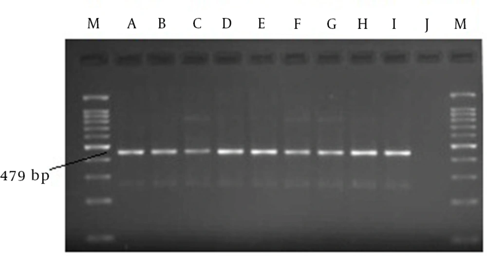 All samples were checked using molecular tests to identify positive serums. As a result, only a fragment of 479 bp was observed by electrophoresis in nine samples. These detectable segments belonged to HBV DNA. Therefore, the PCR analysis confirmed that the prevalence of HBV infection was 5.88% in this population, and none of the other viral infections were found in our examinations. Indeed, similar findings were reported for both the serologic and molecular techniques (Figure 1).