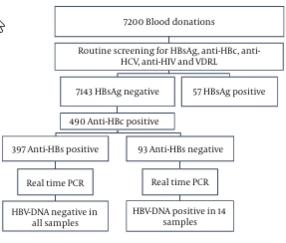 Ensuring blood safety is a global issue since blood transfusion serves as a vital therapy for managing different medical and surgical conditions where a huge number of lives can be rescued following blood administration. Despite that, blood transfusion might represent a major risk factor for the transmission of different infectious agents among which is the hepatitis B virus (HBV). Following HBV infection, antibody responses to different HBV proteins, including anti-HBc and anti-HBs, are detected in human sera (12). Following clearance of transient HBV infection, anti-HBc level remains high for longer periods than other HBV markers, thus serving as a universal indicator for HBV infection (13). The “anti-HBc” serological status could be attributed to different parameters among which are: (a) passive transfer of anti-HBc; (b) a recent HBV infection during which HBsAg has disappeared, while anti-HBs levels are yet undetectable; or (c) chronic HBV infection during which HBsAg is undetectable due to very low viraemia, a clinical phase recognized as occult HBV infection (14-17). Although many countries implement an anti-HBc test before blood transfusion, in an attempt to decrease the risk of HBV transmission, recent studies (18-20) clearly demonstrated an absence of correlation between anti-HBc positivity and presence of HBV-DNA, indicating that anti-HBc screening is not a recommended method to identify HBV infection. For instance, a donor showing positivity for anti-HBc may be a naïve-HBV carrier i.e. a person with a past history of HBV infection or a carrier of non-detectable levels of HBsAg (14, 17, 21-24). The false positive indications obtained in anti-HBc test can lead to discard of large quantities of blood units as well as losing precious blood samples especially those issued from donors exhibiting rare blood types. More recently, triplex nucleic acid tests (NATs) have been implemented in many countries, including the United States and China, during blood screening for infectious agents such as HBV, HCV, and HIV. A major benefit of HBV NAT is the detection of OBI. Moreover, it has been shown that NAT and serological analysis are complementary during detection of HBV in first-time donors, while NAT is more beneficial in the case of repeat donors (25). Alternatively, this method is challenged by the different sensitivities of the existing commercial NAT assay systems (26-28). Nowadays, different approaches can be conceived to reduce the risk of transfusion-transmitted HBV. These vary depending on different parameters including: the socioeconomic situation in a certain country, the prevalence of HBV, and the availability of certain technical services. Hence, different algorithms can be followed, such as a sole serological screening for HBsAg, a test for both HBsAg and anti-HBc, NAT approach, or a combination of serology and NAT. The aim of the present work was to describe a new strategy that ensures blood safety and resolves the problem of false positive results obtained during anti-HBc screen method. During this study, the observed HBsAg-positivity rate (0.8%) was comparable to that identified previously in Lebanese population (0.98% in 1998; 0.75% in 1999; 0.78% in 2000; 0.77% in 2001; 0.66% in 2002, and 0.6% in 2003) (21). The major output of this study was that HBsAg-negative but anti-HBc-positive blood samples, identified among 7200 tested samples, were classified into 2 categories. The first category included anti-HBc positive samples that were positive for anti-HBs. All Samples belonging to this category were negative for HBV-DNA. The second category was composed of anti-HBc positive samples that were negative for anti-HBs. Some of those samples were positive for HBV-DNA whilst others were negative. Interestingly, our observations indicated the association of the absence of HBV-DNA with the simultaneous presence of both anti-HBc and anti-HBs. Of great importance, our data indicates that a double anti-HBc and anti-HBs test would be beneficial to ensure blood safety and avoid loss of blood units. For instance, instead of directly discarding a blood sample showing positivity for anti-HBc, an additional screen for anti-HBs positivity will lead to keeping this sample. Hence, our proposed diagnosis strategy will be highly beneficial at both medical and socioeconomic levels.