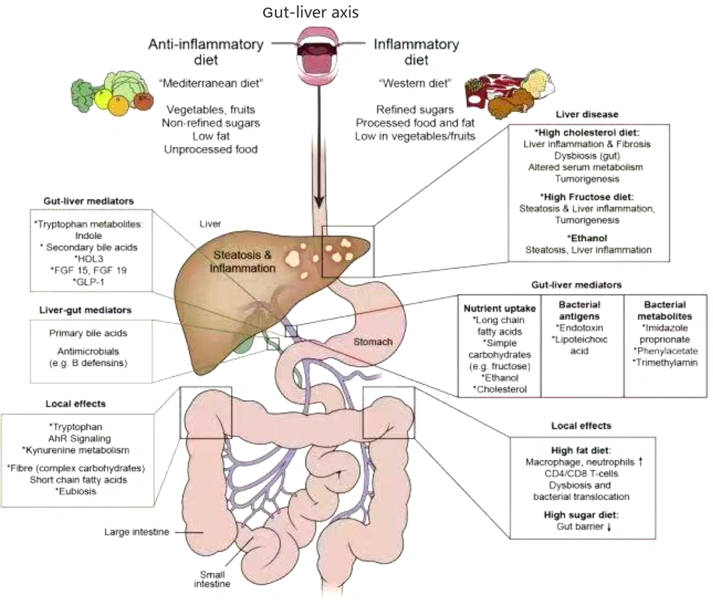 The gut-liver axis constitutes a bidirectional communication network integrating the intestine, gut microbiota, and liver via the portal venous system (Figure 1). Intestinal microbiota and their metabolites serve as pivotal mediators of this axis, and microbial homeostasis and intact intestinal barrier function are essential for maintaining hepatic immune tolerance (2). Under physiological conditions, minimal quantities of dietary antigens, commensal bacteria, and toxins traverse the portal circulation to the liver, triggering immune surveillance and detoxification. Concurrently, bile acid homeostasis, which is regulated through the dual mechanisms of hepatic synthesis and intestinal biotransformation, stabilizes the microbial composition, thereby modulating systemic metabolism (e.g., glucose and energy homeostasis) (3).