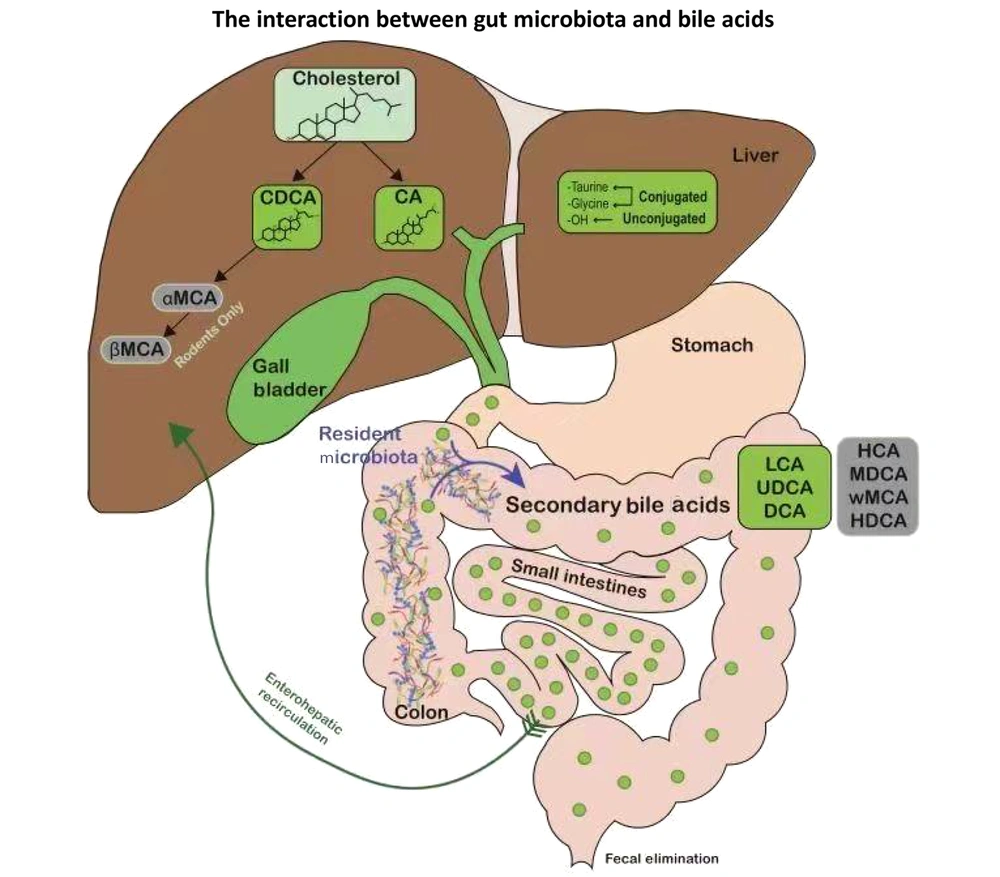 Bile acids play crucial roles in fat digestion, cholesterol metabolism, and gut microbiota regulation. The gut microbiota converts primary bile acids into secondary bile acids, and nearly 95% of bile acids undergo enterohepatic circulation, recycling via the portal vein to the liver (7). This cycle is essential for maintaining intestinal microbial homeostasis and preventing dysbiosis (8). Disruption of the gut microbiota alters bile acid metabolism, affecting its composition and quantity (9). The bile acid receptor FXR is expressed in various tissues, with the liver and ileum being the most studied organs. Research has found that FXR, a bile acid receptor, regulates bile acid synthesis by inducing intestinal FGF19, which inhibits hepatic cholesterol 7α-hydroxylase activity (10, 11). Bile acids possess antimicrobial activity and can inhibit the growth of intestinal bacteria, thereby reshaping the gut microbial community. Bile duct ligation leads to gut microbiota dysbiosis, whereas FXR agonists can maintain the integrity of the intestinal barrier in bile duct-ligated mice and alleviate liver injury (12, 13).