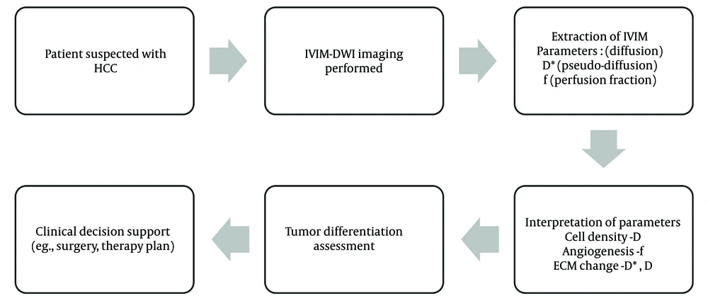 Among recent advancements in imaging, diffusion-weighted imaging (DWI) has emerged as a promising tool in oncologic imaging. The IVIM, an extension of DWI, enables the simultaneous quantification of true molecular diffusion and microcirculatory perfusion without the use of contrast agents. This is especially advantageous in patients with cirrhosis and impaired renal function (4). The IVIM model, introduced by previous researches, decomposes the diffusion signal into a slow component (pure diffusion, D) and a fast component (pseudo-diffusion), with the perfusion fraction (f) representing the volume fraction of microcapillary perfusion within a voxel. These parameters are believed to reflect cellular density, extracellular matrix content, and tumor angiogenesis — critical features that vary according to tumor grade (Figure 1) (5, 6).