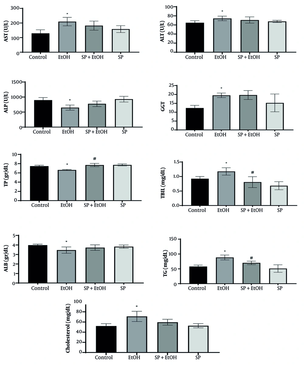 From a clinical perspective, the most important standard parameters for liver function tests and the most useful biochemical and physiological indicators of hepatotoxicity are aminotransferase activities, TBIL, TP, and ALB. Chronic alcohol consumption leads to structural changes in liver tissue, including alterations to membrane proteins, reduced structural stability, increased membrane permeability, and eventual cell breakdown, resulting in the release of AST, ALT, ALP, GGT, and TP into the bloodstream (10, 42). The present data are consistent with previous studies and predictions (9, 43). The GGT, a plasma membrane enzyme, is essential for glutathione homeostasis. Increased oxidized glutathione and hepatic GGT promote extracellular GSH metabolism, with γ-glutamyl peptides converted to precursor amino acids for intracellular GSH synthesis (44, 45). Therefore, GGT is closely linked to liver status in ALD diagnosis. No significant difference in GGT activity was observed between the EtOH and SP+EtOH groups.