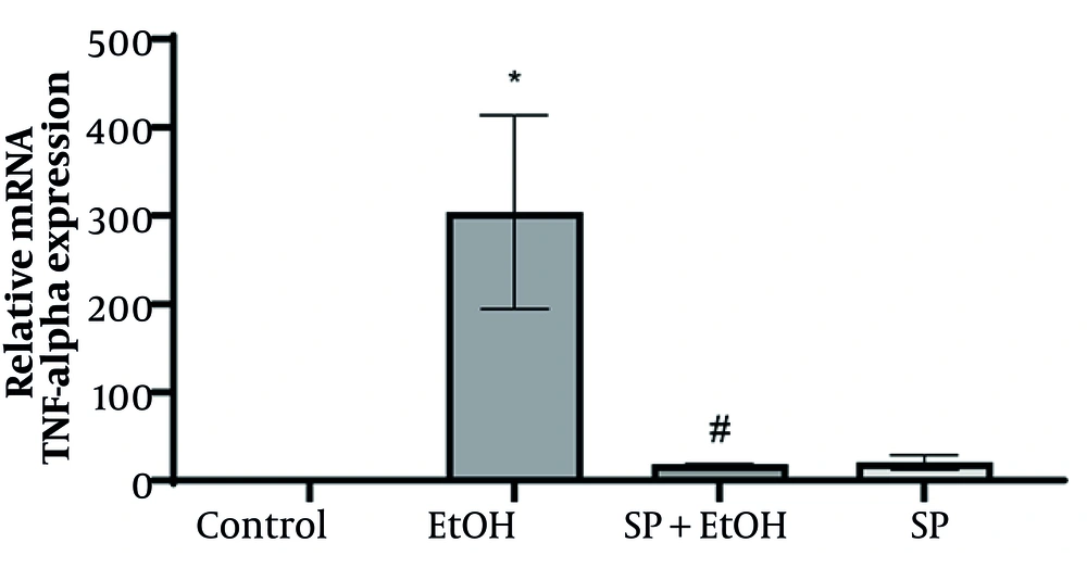 Effect of Stachys pilifera Benth on tumor necrosis factor-α (TNF-α) mRNA levels in rats with alcohol-induced liver damage (Abbreviations: SP+EtOH, ethanol-Stachys pilifera Benth; EtOH, ethanol). Data are expressed mean ± SEM. * Significant difference (P ≤ 0.05) between control and EtOH groups, # significant difference (P ≤ 0.05) between SP+EtOH and EtOH groups. A P-value ≤ 0.05 is considered statistically significant.