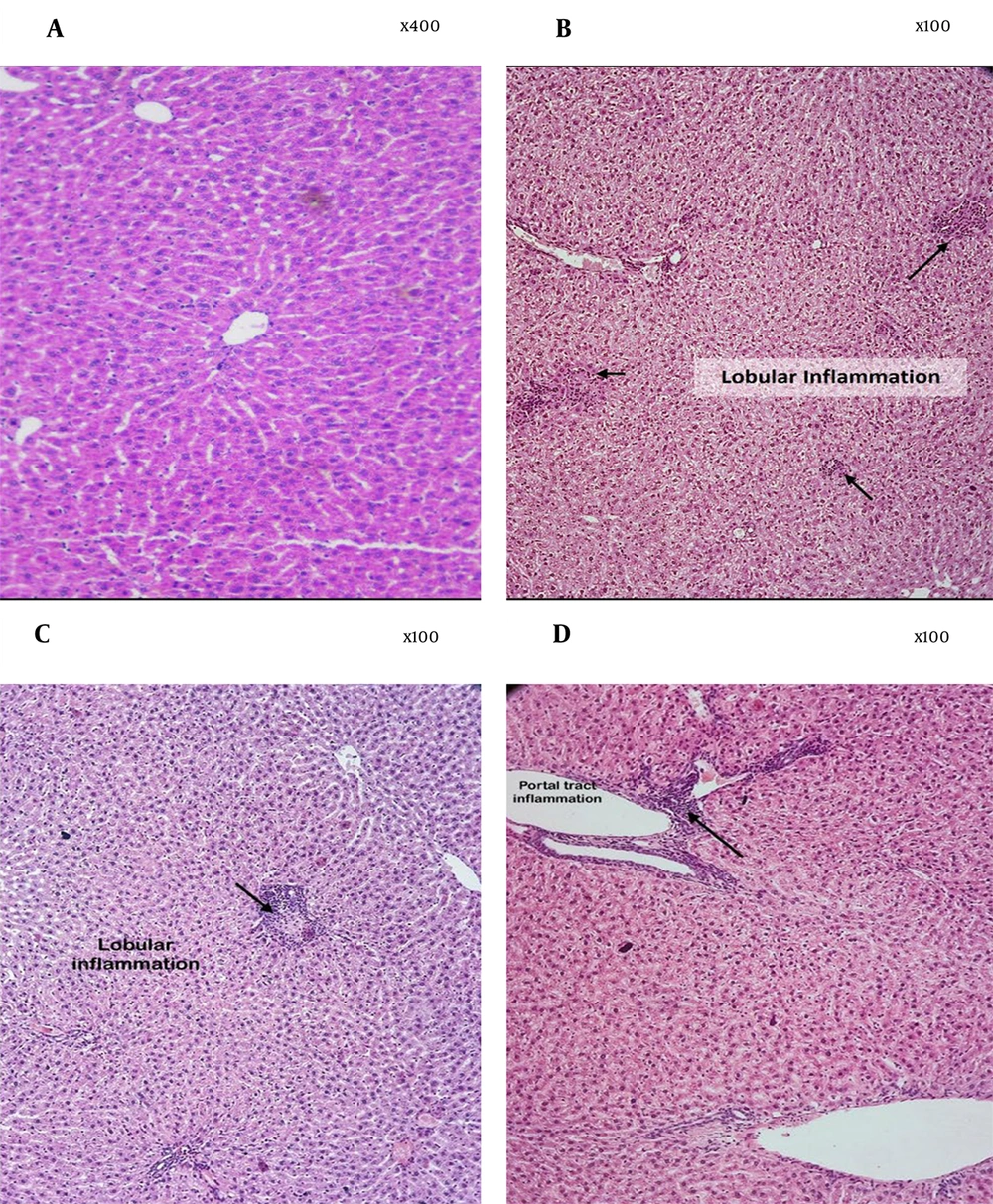 At the end of day 35, animals were weighed. Twelve hours after the final oral dose, the animals were anesthetized with pentobarbital (60 mg/kg body weight), blood samples were collected, and the animals were sacrificed. Blood was centrifuged at 3000 rpm for 10 minutes, and serum was stored at -20°C for biochemical analysis. Liver tissue was fixed in 4% paraformaldehyde for histological analysis. Other liver sections were homogenized in phosphate-buffered saline (PBS, pH 4.7, 50 mM/L) and stored at -20°C for further analysis. The final portion was frozen in liquid nitrogen at -80°C for gene expression analysis (6, 36).