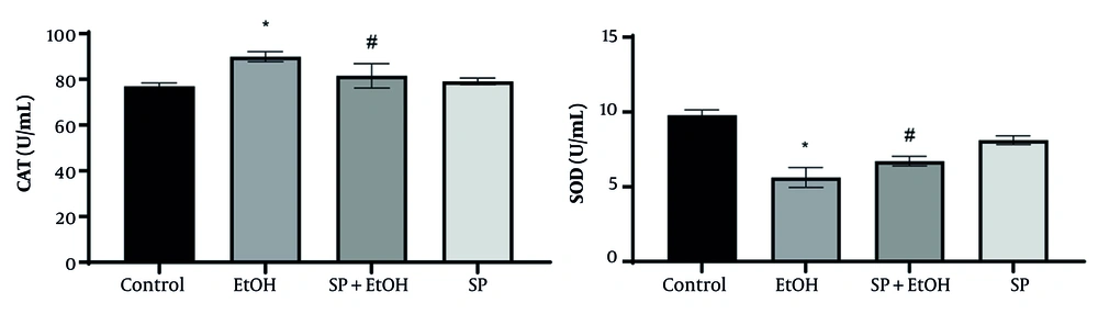 Healthy cells rely on antioxidant enzymes such as CAT, SOD, and GPx to defend against ROS (40). The SOD catalyzes the reduction of superoxide radicals to O2 and H2O2, while CAT breaks down H2O2 into water and oxygen (54, 55). Li et al. (42) reported decreased CAT and SOD activity in ALI mice compared to controls, while other studies found increased CAT activity with chronic alcohol consumption (56). Our results showed reduced SOD and increased CAT activity after EtOH administration, indicating an active defense response. Stachys pilifera Benth extract significantly increased SOD activity, but reduced CAT activity, possibly due to an inability to eliminate increased radicals. The phenolic content of S. pilifera Benth may protect the liver by reducing free radical production, enhancing antioxidant enzyme activity, and decreasing oxidative stress.